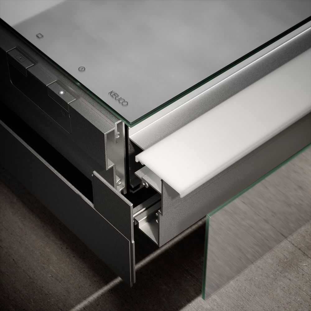 Die Bedienung ist praktisch unterhalb des Aluminium-Spiegelschrankes angebracht. Sie kann im geschlossenen und geöffneten Zustand betätigt werden. Icons auf der Spiegelfläche weisen zur entsprechenden Taste. Die seitlich angebrachte LED-Beleuchtung sorgt für eine perfekte Ausleuchtung des Gesichts. Diese kann stufenlos gedimmt werden. Die optionale Spiegelheizung garantiert eine freie Sicht nach dem Duschen – besonders in kleinen oder in fensterlosen Bädern. Nach 20 Minuten stellt sie sich automatisch wieder ab.